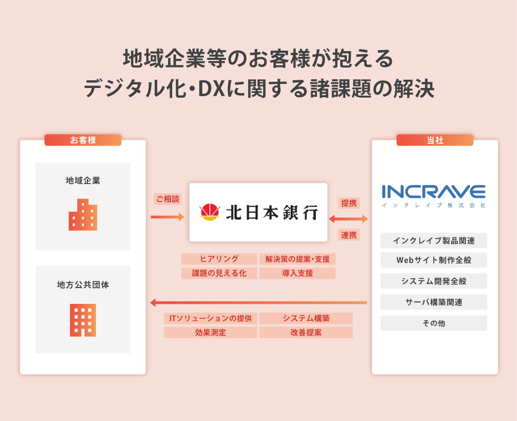 インクレイブ株式会社(本社:宮城県仙台市、代表取締役会長:吉尾 徹)は、株式会社北日本銀行(本社:岩手県盛岡市、代表取締役頭取:石塚 恭路、以下「北日本銀行」といいます。)と、ビジネスマッチング契約を2026年3月17日に締結しました。